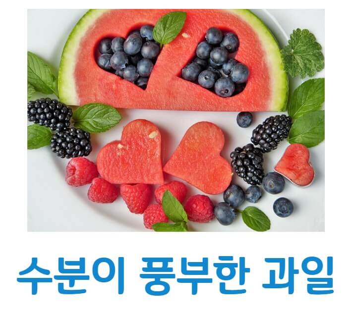 수분이 많은 식품 : 수분이 많은 식품을 섭취하는 것도 수분 섭취의 한 방법입니다. 수박, 오이, 토마토 등 수분이 풍부한 과일과 야채를 적절히 섭취하여 체내 수분을 보충할 수 있습니다.