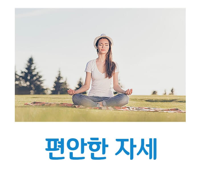 ⓛ편안한 자세: 편안한 자세로 앉거나 누워 시작합니다. 등을 펴고 어깨를 이완시키며 긴장을 풀어주세요.